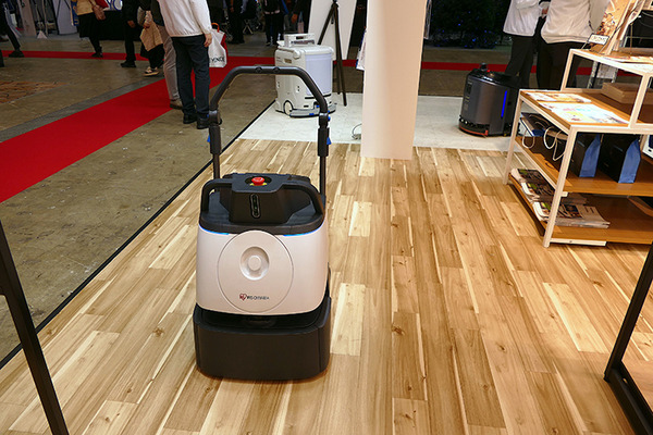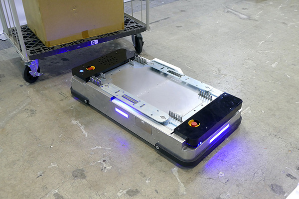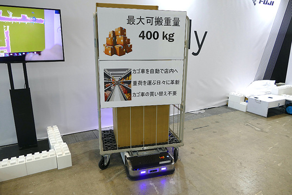 店舗内を走らせてマップを作成後、かご車を取りに行く場所と届ける場所を設定。スケジュールをセットするとロボットが走行する。専門のSIerは不要だという。最大可搬重量は400kgで、飲料や資材など重たい商品をバックヤードから店舗内に運ぶ業務の一部の自動化を想定している。現在、ホームセンター大手で実証実験中とのことだ。