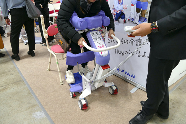 まずFUJIは移乗サポートロボット「Hug」を3タイプ紹介していた。同社の「Hug」シリーズは累計で4000台出荷されており、介護ロボットのなかでも注目株である。介護者の離職理由の一因である腰痛の軽減に貢献しており、月産100台は出荷しているが、まだまだ認知度向上には課題があると感じているという。