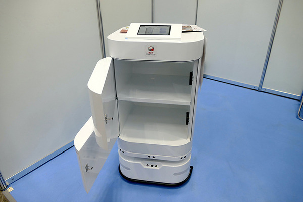 QBIT Roboticsは館内配送ロボット「DR2」を出展。サービスロボットシステムインテグレーターとして事業を展開している同社だが、現在はロボットのほか、スマホやタブレットのカメラだけを使って血圧、脈拍、血中酸素、心拍などを簡易に測定できるシステムなどを開発し、他社との共同開発を行いたいと考えているとのことだった。