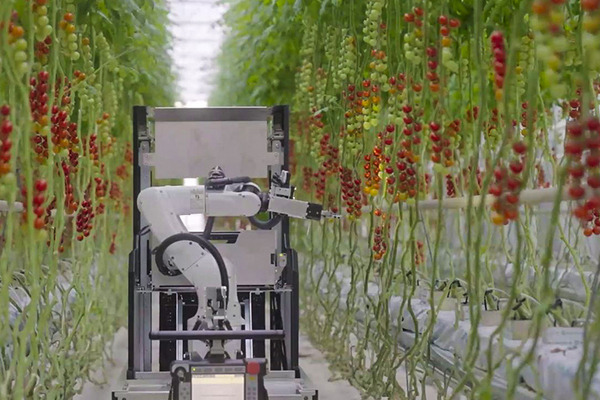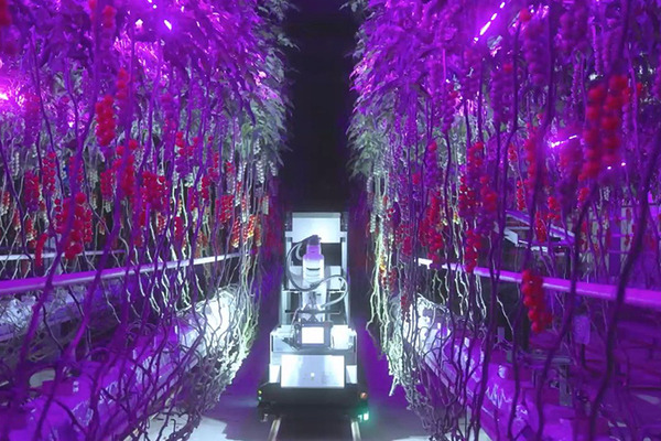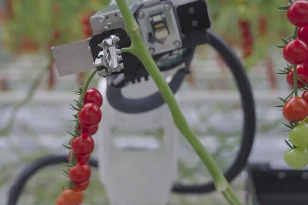 カメラとAIでトマトの成長を識別し、収穫の是非(熟度)を自動判別してハサミで切って収穫する。