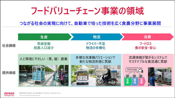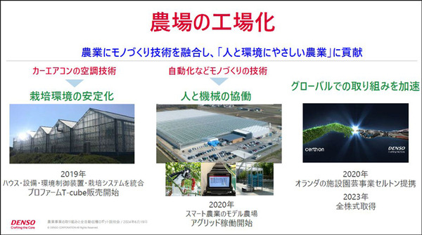 デンソーは従来のクルマ産業主体の事業に加え、農業分野もビジネスの柱に成長させていきたい考えだ。その上で、カーエアコンの空調ノウハウを活かして「栽培環境の安定化」、自動化などモノづくり技術を活かした「人と技術の協働」、グローバルでの取り組みに繋がる事業拡大を念頭に「農業の工業化」を掲げた。