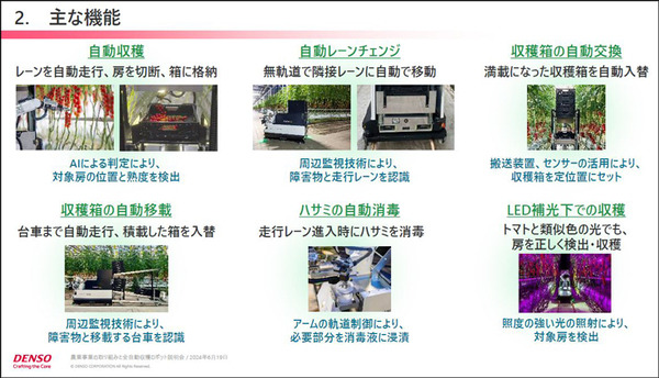 株式会社デンソーは、房取りミニトマトの全自動収穫ロボット『Artemy』(アーテミー)を共同開発し、欧州での受注を2024年5月13日より開始していることを発表した。