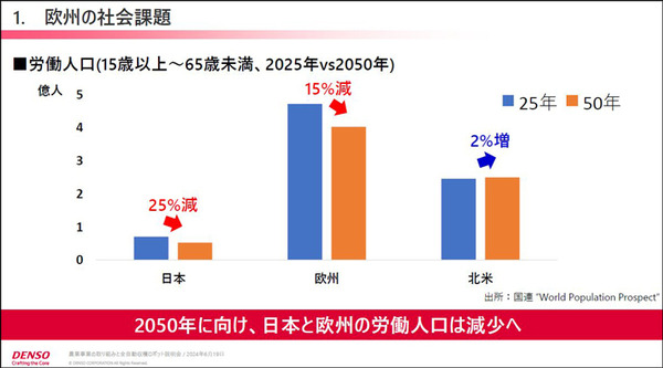 また、15歳から65歳までの労働人口の比較をみると、北米では2050年に向けて微増である一方で、日本では25%、欧州では15%の減少が見込まれています。欧州においても労働力不足が喫緊の課題となっています。