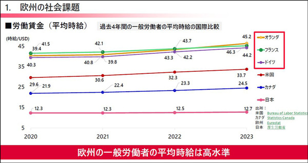 労働賃金も国際比較において、オランダ、フランス、ドイツといった西欧諸国が日本や北米に対して非常に高い。