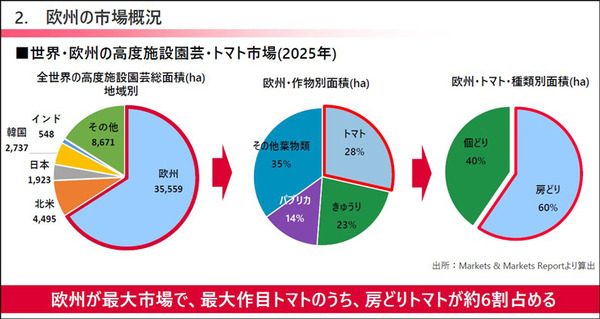 高度施設園芸の総面積を見ると、欧州の規模が最も大きく(下図の左)、欧州の中ではトマトの収穫面積が最も大きい(下図の中央)ことが、欧州のトマトにフォーカスした理由だと語った。