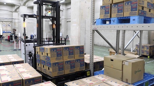 たとえばTOTO株式会社小倉物流センターでは2台の「ラピュタAFL」を使って上階から降りてくるパレットを出荷仮置き場まで自動搬送させている。垂直搬送機で降りてきたパレットを、「ラピュタAFL」がトラックバースの出荷仮置き場まで100m運ぶ。仮置き場まで自動フォークリフトが運んだあとは、有人のフォークリフトで搬送する。