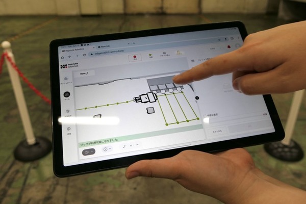 「ラピュタAFL」への指示はタブレットで行う。比較的簡単なユーザーインターフェースで、直感的な操作が可能だ。移動させるパレットや場所などの作業内容をGUI画面で指示したあと、自動モードを指定してロボットを動かす。