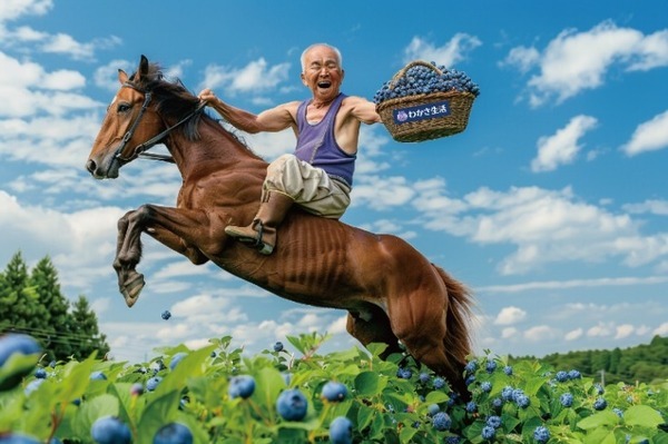 看板商品「ブルーベリーアイ」を想起させるブルーベリー畑で、Xで話題の広報担当の「馬」を乗りこなすじいちゃん。