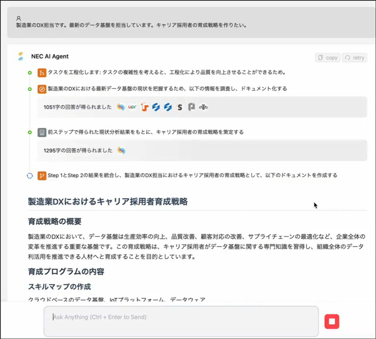 例えば、「キャリア採用者の育成戦略を作りたい」と入力した場合、指示内容から最終成果物を育成計画書と設定し、社内外の情報収集や分析、プログラムの生成・実行など、複数のタスクに分解する。