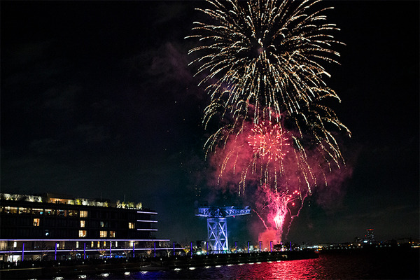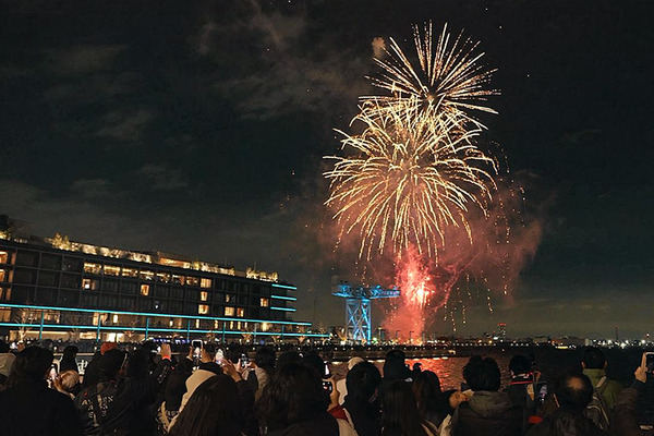 19時ちょうど、いよいよ「横浜スパークリングトワイライト2024」、約5分間の花火のショーが始まりました。ハンマーヘッドのクレーンの上空に打ち上がった花火に場内からは歓声が上がりました。
