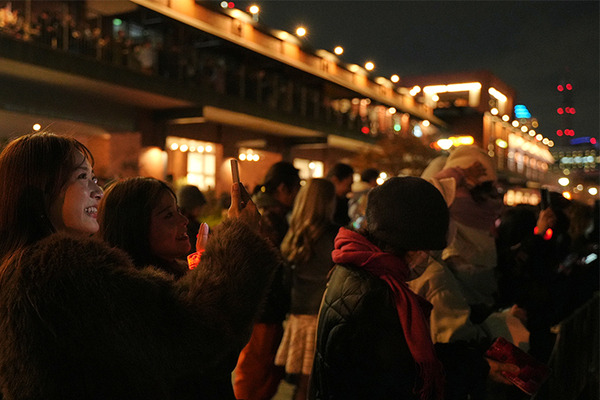 19時15分、いよいよ「コカ・コーラ クリスマスドローンショー2024」の開始です。と、思いきや、会場内には「上空は強風のため、開始時間が10分間延期される」旨のアナウンスがありました。そういえば、埠頭の風が強くなっている気がしました。