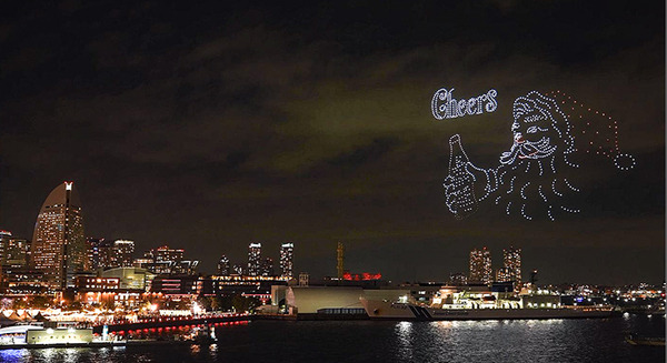 ドローンたちはハンマーヘッドクレーンの上空まで浮上し、流れる音楽に合わせて隊列を組んで、ソリを引いたトナカイたちとサンタクロースが夜空に浮かび上がると、場内からは割れんばかりの歓声が響き渡りました。サンタクロースの赤い衣装と白い髭の風貌はコカ・コーラのキャンペーンが起源とされています。
