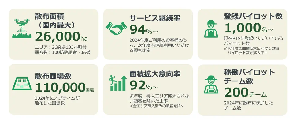 2024年度の水稲防除における実績では、26府県133市町村のエリアにて、約100防除組合・JA等の顧客に約26,000ha、約11万圃場で導入。国内ドローン散布サービスにおいて最大規模となった。また、2024年度「ピンポイントタイム散布サービス」を利用された顧客に評価してもらった結果、94%以上もの顧客が2025年度の継続利用意向、92%以上の顧客から利用拡大意向があったとしている。