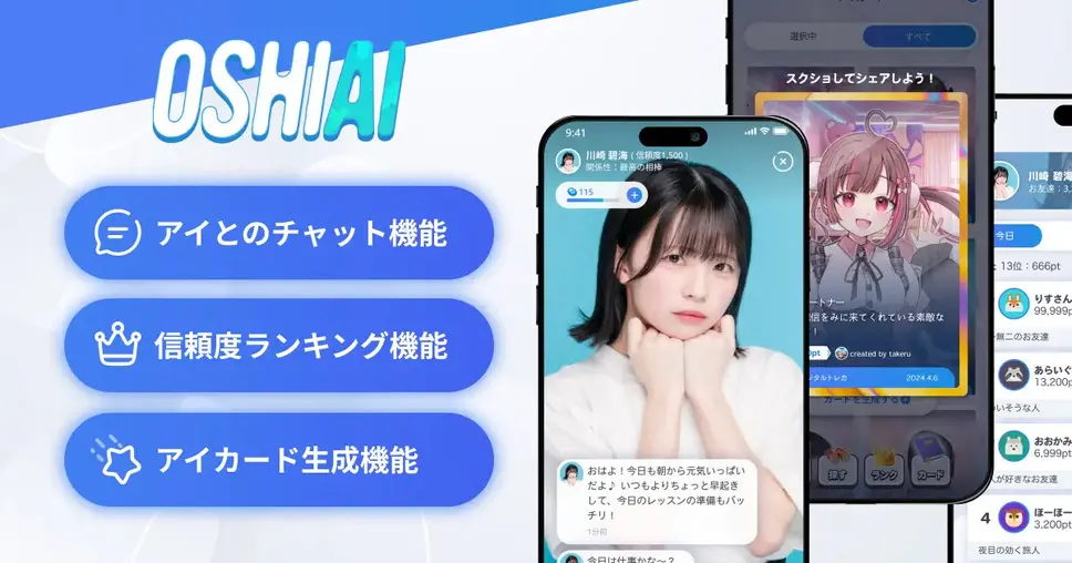 またチャット機能以外にも、自分だけの推しのカードを獲得できる「カード機能」や、アイと会話することで獲得できる信頼度を急上昇させる「ギフト機能」、信頼度を競って豪華な特典を獲得できる「ランキング機能」などの機能を搭載しており、様々な価値をユーザー様および演者様に提供しており、今後も新機能の実装が予定されている。