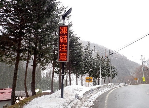 今回設置のLED表示板(オプトマーカーV)は、道路状況、気象情報を文字やピクトで表示することで、歩行者やドライバーに注意喚起し、事故を未然に防止、安全をサポートする。