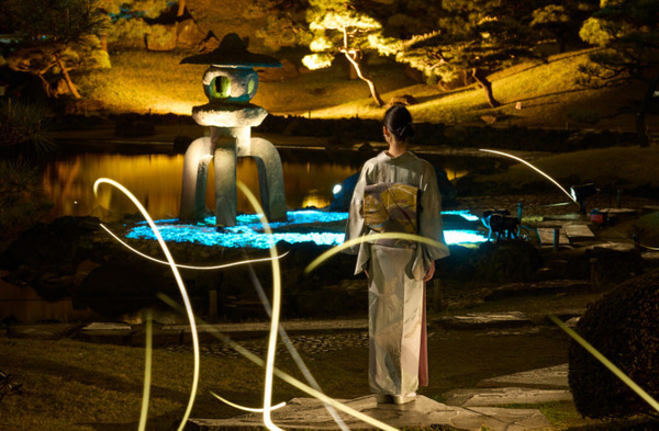 7回目となる今回は、潮入りの池を中心に、庭園に古くから佇む景石や築山、灯籠などの造形に光と音を重ね、それぞれが持つ歴史や美しさを際立たせる演出を展開する。また、例年より回遊可能なエリアが広がり、今年は馬場跡まで巡ることができるようになった。