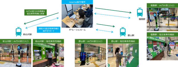 今回の実証実験では、新白河駅・郡山駅・福島駅の3駅にアバターロボット「newme(ニューミー)」を設置し、一拠点から複数駅のロボットを遠隔操作する。実験期間は2025年7月13日から8月31日までの予定。アバターロボットを通じて顧客に声をかけ、指定席券売機への案内や購入方法などを確実に案内できるかを検証する。操作は東京都中央区にあるavatarin株式会社のオフィスから行う。