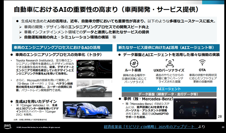 岡本氏は、経済産業省が策定した「モビリティDX戦略」の2025年版アップデートに言及。車両開発やサービス提供の高度化に加え、AIエージェントの登場によって質の高いサービス実現に向けたAIの重要性が一層高まっていると指摘した。