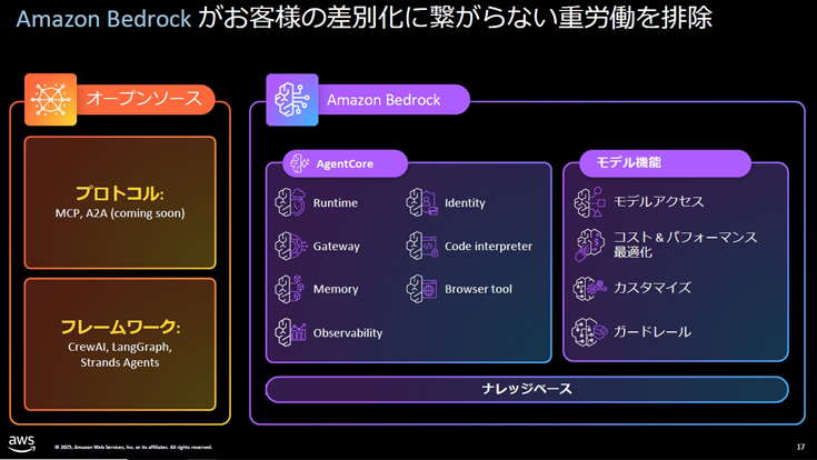 また、2025年7月にはAIエージェントの構成要素をモジュール化した新機能「AgentCore」も追加された。