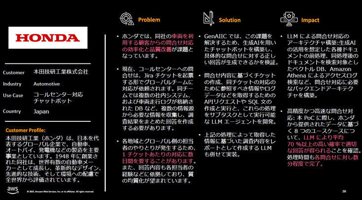 続いて、ホンダのAWS活用事例をもう1つ紹介した。2点目のはドライバーが困った時に問い合わせるコールセンターの体験向上。