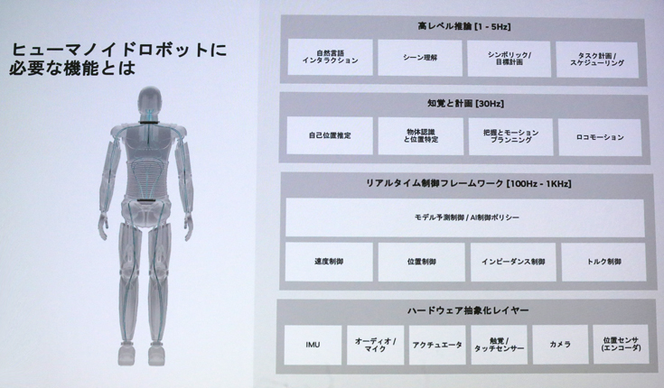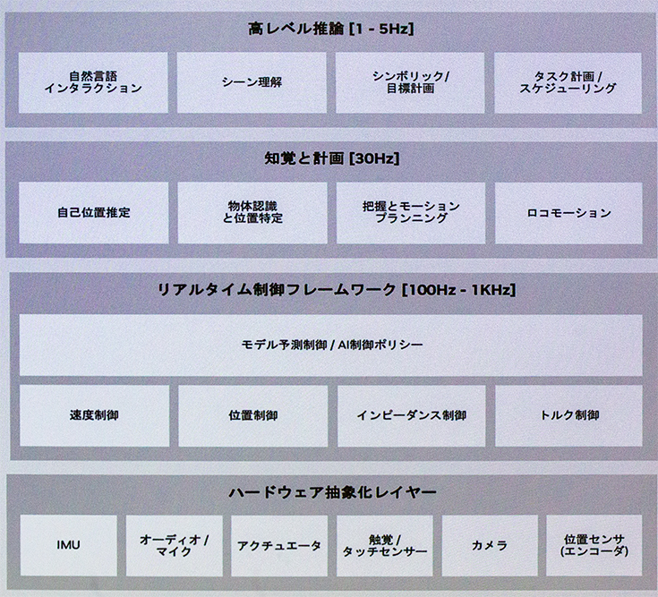 高レベル推論(1~5Hz)、知覚と計画(30Hz)、リアルタイム制御フレームワーク(100Hz~1KHz)、そしてハードウェア抽象化レイヤーに分けている。それぞれのレイヤーがどのくらいの周期(頻度)で更新・処理される必要があるかを示すのを「Hz」で示している。
