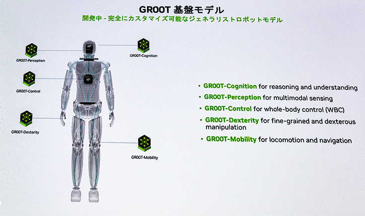 加瀬氏は「NVIDIAでは、これらをGR00Tの「Cognition」「Perception」「Control」「Dexterity」「Mobility」に分けて研究開発し、開発者の皆さんが使いやすいように提供しようと考えている」と説明した。