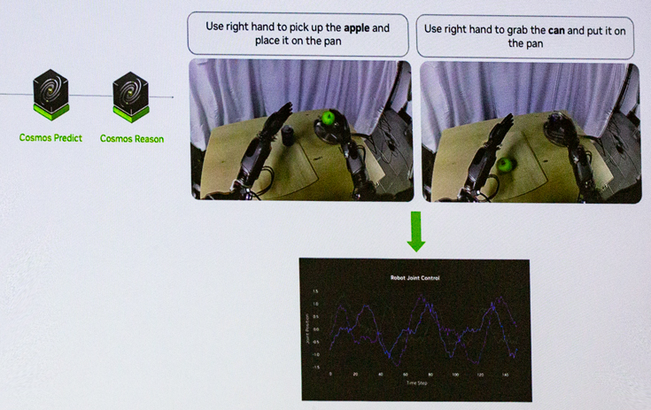例えば「リンゴをつかんで右のフライパンのところに置いてください」といったプロンプトに従って、Cosmos世界基盤モデルを通して行動すべき動画が生成される。