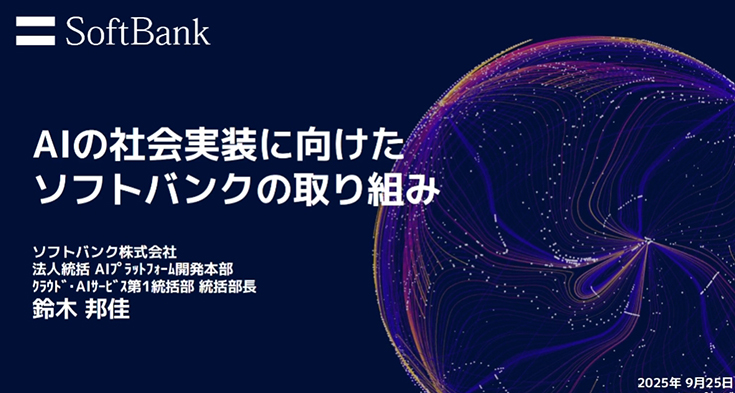 ソフトバンクは、法人統括AIプラットフォーム開発本部の鈴木邦佳氏が登壇し、今後のAI社会に不可欠な「次世代社会インフラ」を実装していくソフトバンクの長期ビジョンに対して、1万基超のGPUで構成されるAI計算基盤に関する取り組みと、具体的な活用事例として日本語に特化した国産大規模言語モデル「Sarashina」について紹介した。