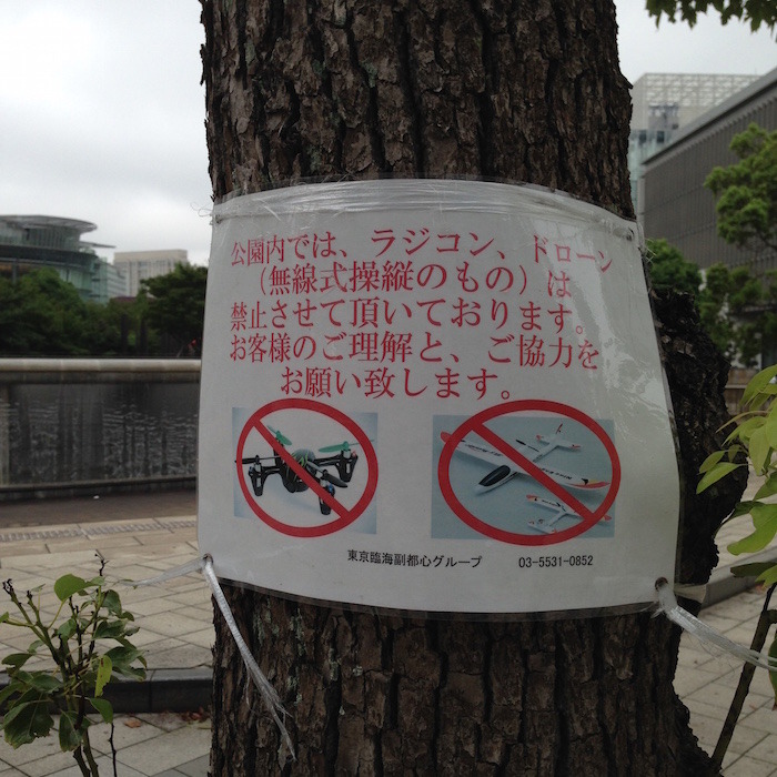 日本科学未来館の近辺では、ドローンが禁止されてました。場所柄な貼り紙ですね。