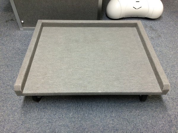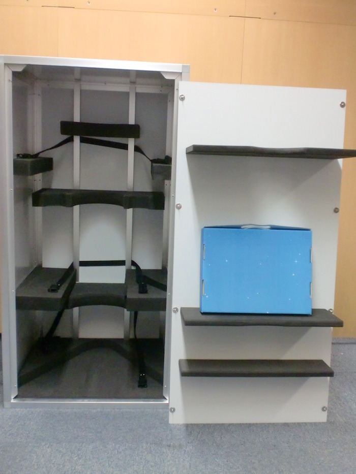 1からPepperを型取りして作成したケースは、フレームに軽くて強度もあるアルミを使用し、各面の外板には外板自体の傷付き防止のため、にアルミ複合版にパンチカーペットを貼ったものを使用。