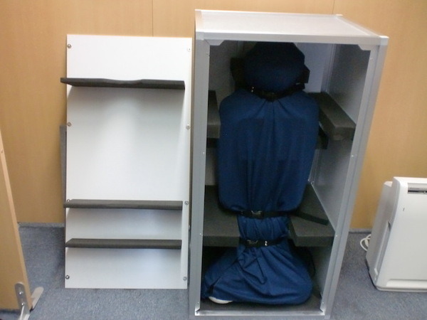使用時には、Pepperを専用の袋に入れて埃から保護して、ウレタン部に収納します。ウレタンはPepperの要所要所を支え、更にベルトを使って固定します。