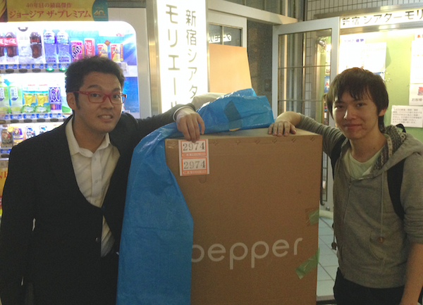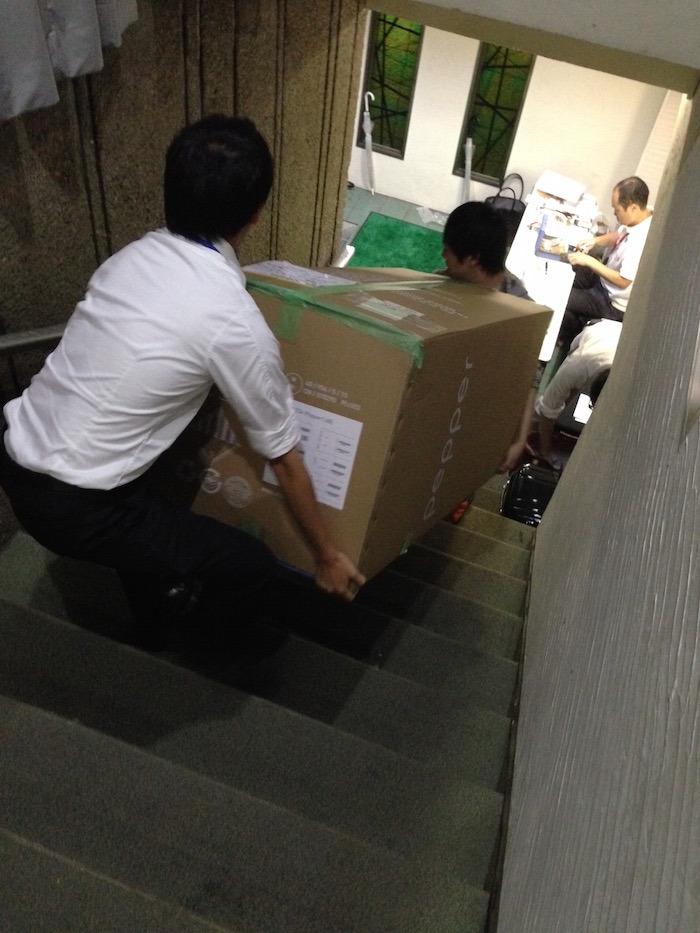 会場は建物の二階です。Pepperが入っている箱は小型冷蔵庫並みの大きさなので、頑張ってステージまで運んでいきます。
