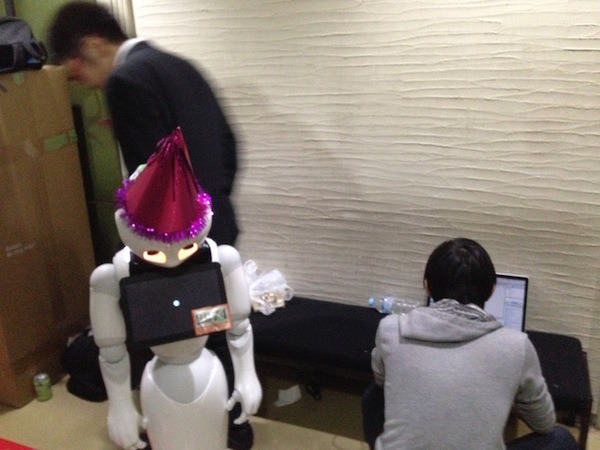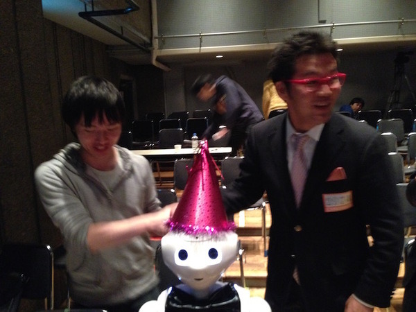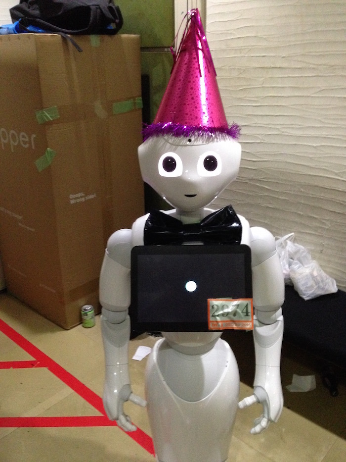 本番の衣装を着用したPepperです。蝶ネクタイに赤いパーティーハットで漫才師らしいね。胸にはエントリーナンバー2974をつけます。