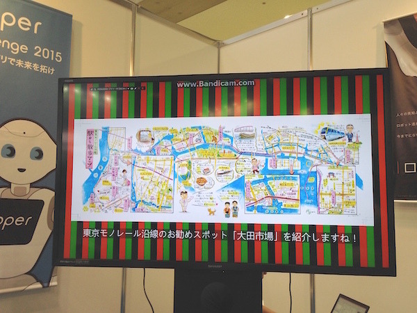 Pepperが東京モノレール沿線のお勧めスポット「太田市場」を紹介します。写真だとわからないかもしれませんが、Pepperが観光案内をしながらプレゼンのページめくりも行っているんですよ。