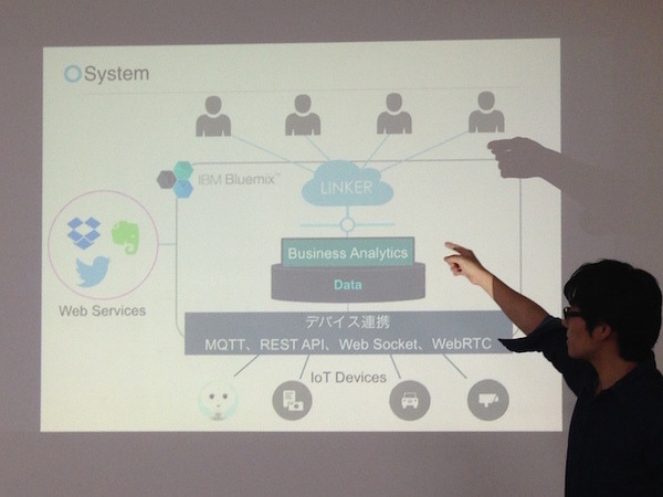 システム構成です。LINKER は IBM Bluemix を使い、ウェブサービスやIotデバイス連携をしています。