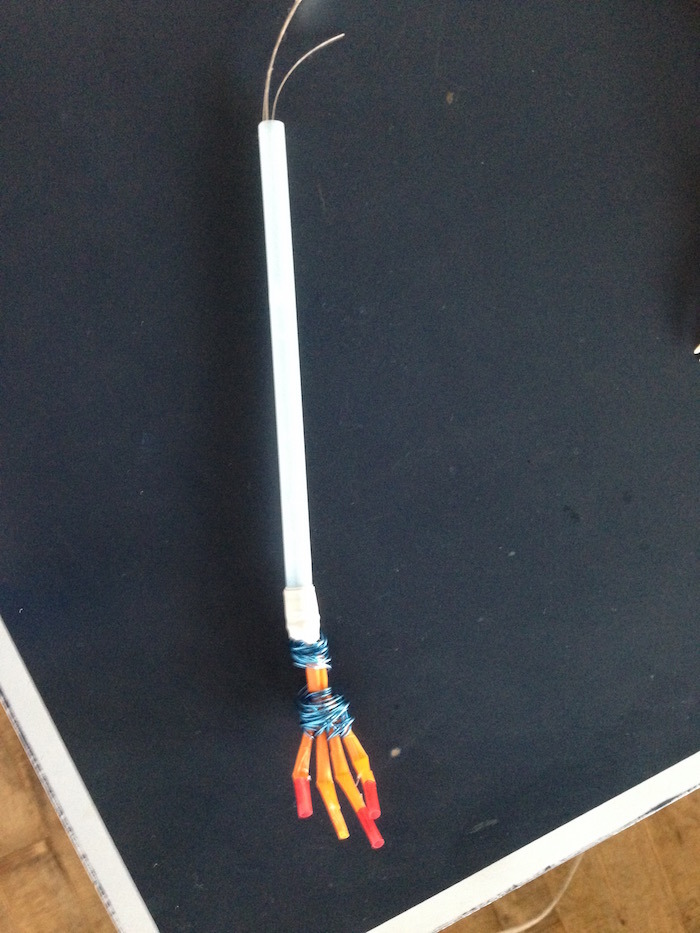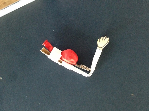 これはダンボールと風船で作られた手。風船を膨らますと手が動くという仕組みです。