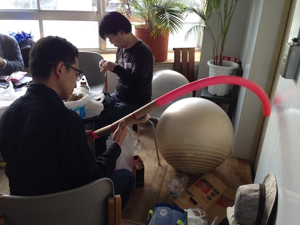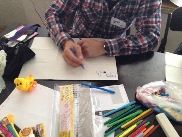 自己紹介とアイデアが出揃ったので、100円ショップに買い出しをしてから、制作タイムです。