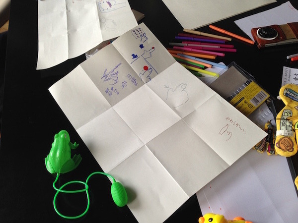 いくつかのイラストが書かれた時点で、自分のところに紙を戻し、どういうイラストが描かれたかを見てみます。最初は自分のイラストだけだったけど、みんなで回し描きしていくうちに、思いもつかなかったイラストが描かれたりします。