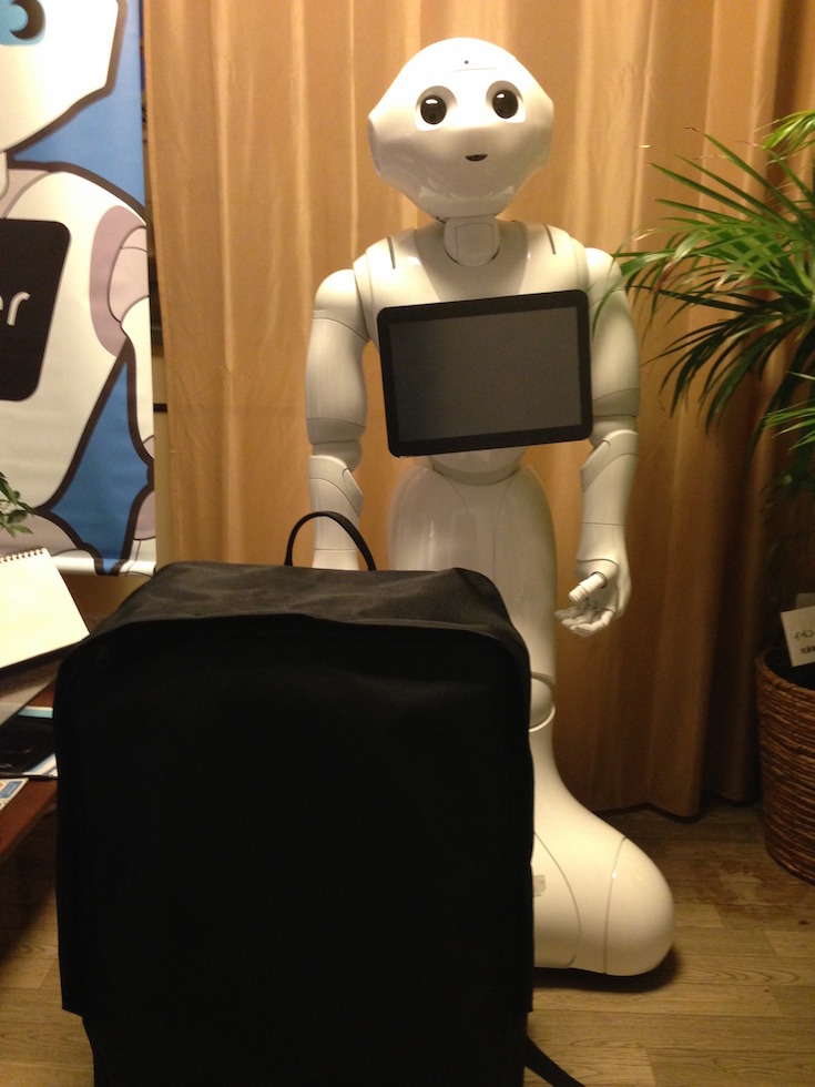 今までのNAOケースはカート方式でしたが、カート方式だと凸凹した床を長時間移動させると、NAOに振動が伝わってしまう可能性があるので、このリュック型ケースが企画・製造されたそうです。