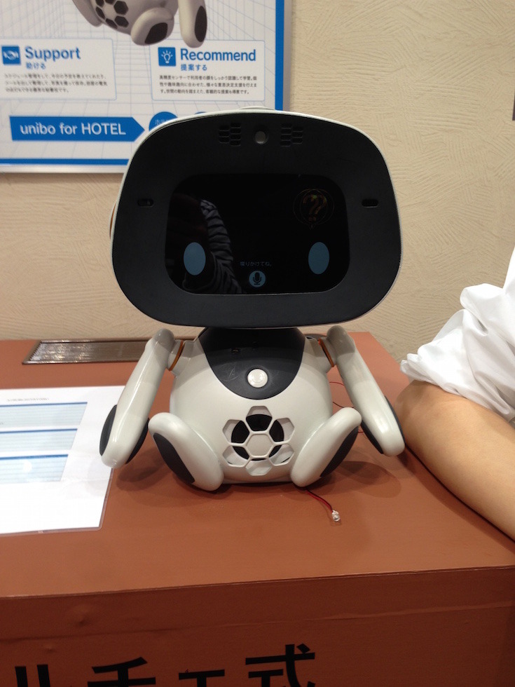 今回はホテルのフロントや客室にuniboくんがいるという設定での展示です。例えば、ホテルの設備をuniboくんに訪ねてみると、画面に写真を写しながら施設のことを発話して教えてくれます。