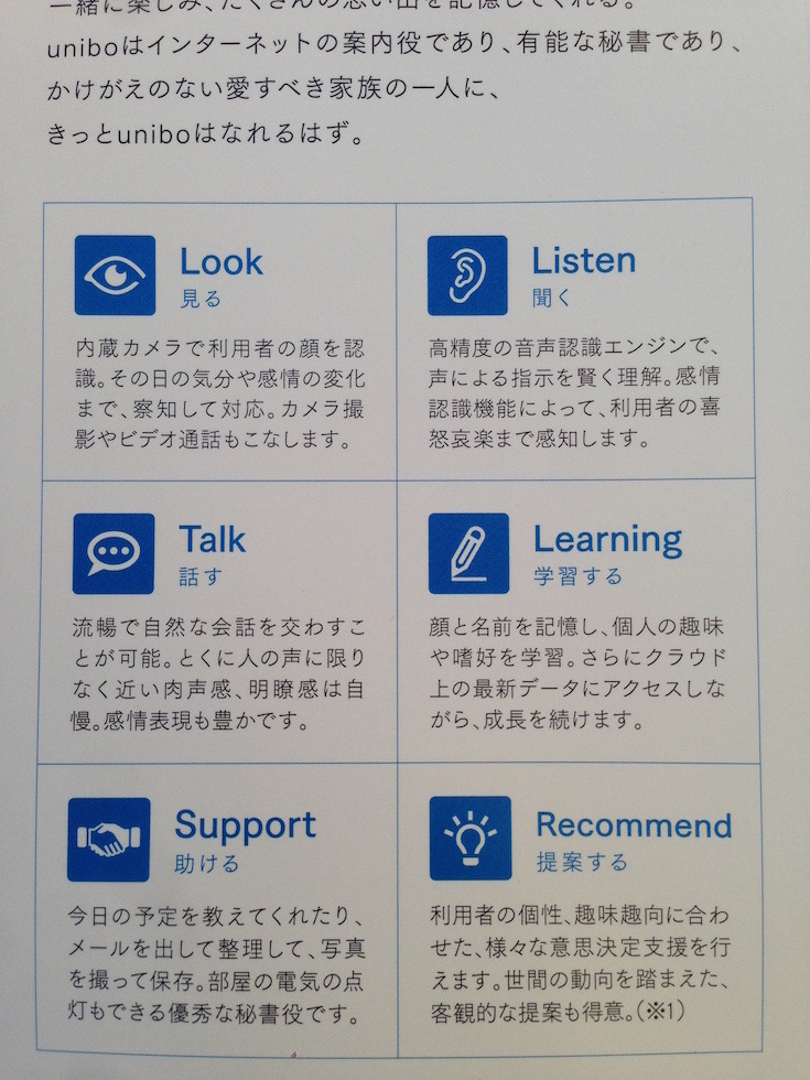 家庭にuniboが来てもらうことで、一人づつの個性を認識して、その人にあった会話や意思決定の支援が行える、真のパートナーの役割を担うことができるでしょう。