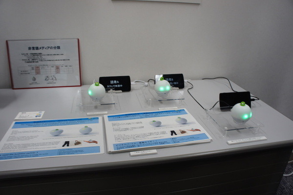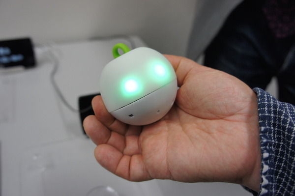 実物を見てみると、見た目は手の平サイズの球型で、触ってみると上半分は人肌のような素材でできています。ぽよんぽよんとした柔らかそうな上下の動きと共に、人の目のようなLEDがピカピカと光って表現を行います。