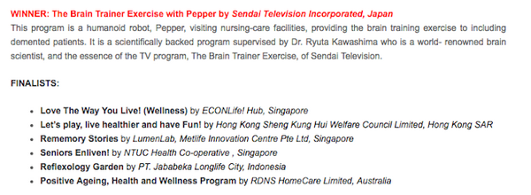 今回受賞したのはベストウェルネス部門の最優秀賞。公式サイトを見てみると、確かにBEST WELLNESS PROGRAMME – COMMUNITYに「WINNER: The Brain Trainer Exercise with Pepper by Sendai Television Incorporated, Japan」とありました。