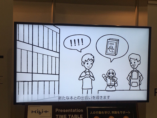 例えば、本屋にいるKibiroくんは、人工知能から自分も店員さんも気づかないような新たな本との出会いを導きます。