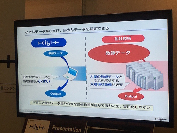 Kibiroくんに入っている人工知能KIBITの特徴です。少ない教師データからでも人工知能を学習させることができます。教師データが少なくてもよいということは、サーバー等の設備もわずかで大丈夫です。