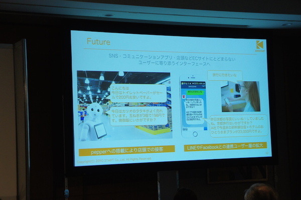 僕たちはパーソナライズするためのエンジンなんですね。SENSYとIBM Watsonとの連携では、チャットボット的に会話部分のUIにIBM Watsonを使うというもの。もう1つはリアルな店舗でPepperや他のロボットでiPadでお客様に操作をさせたり、音声会話で処理を組み合わせることを考えています。