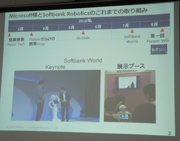 まずは、過去半年のMicrosoftとソフトバンクロボティクスの取り組みについて。3月に両社の協業を発表してから、4月に「Pepperだらけの携帯ショップ」、5月に「de:code」、7月に「ソフトバンクワールド」、8月にこの「第一回Pepper WG」と、毎月のように取り組みがされています。