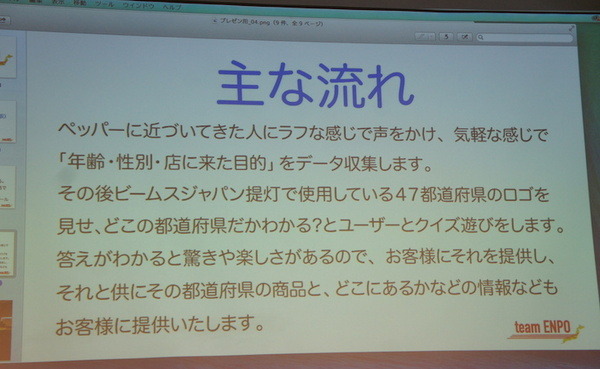 その後、ビームスジャパン提灯で使用している47都道府県のロゴを見せ、どこの都道府県かを当てるクイズをPepperと行います。