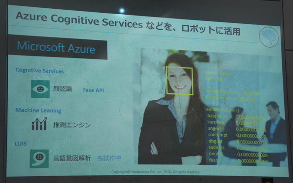 Azure Cognitive Serviceなどをロボットに活用しています。具体的には、顔認識(Face API)、推測エンジン(Machine Leaning)、言語意図解析(LUIS)などを使っています。