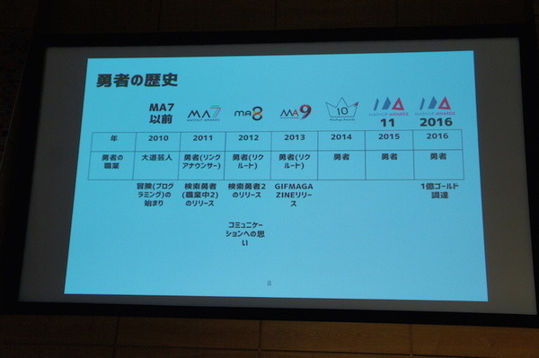 検索勇者さんからは「勇者の歴史」ということで、MashupAwardに参加した歴史と成長の軌跡を紹介いただきました。